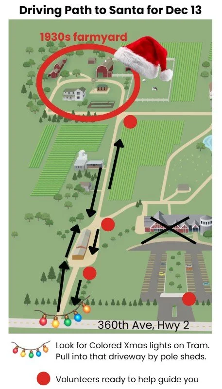 Turn into the driveway by the tram with colored Christmas Lights, right off 360th Avenue, by pole sheds. Not the visitor center parking lot. See route below.