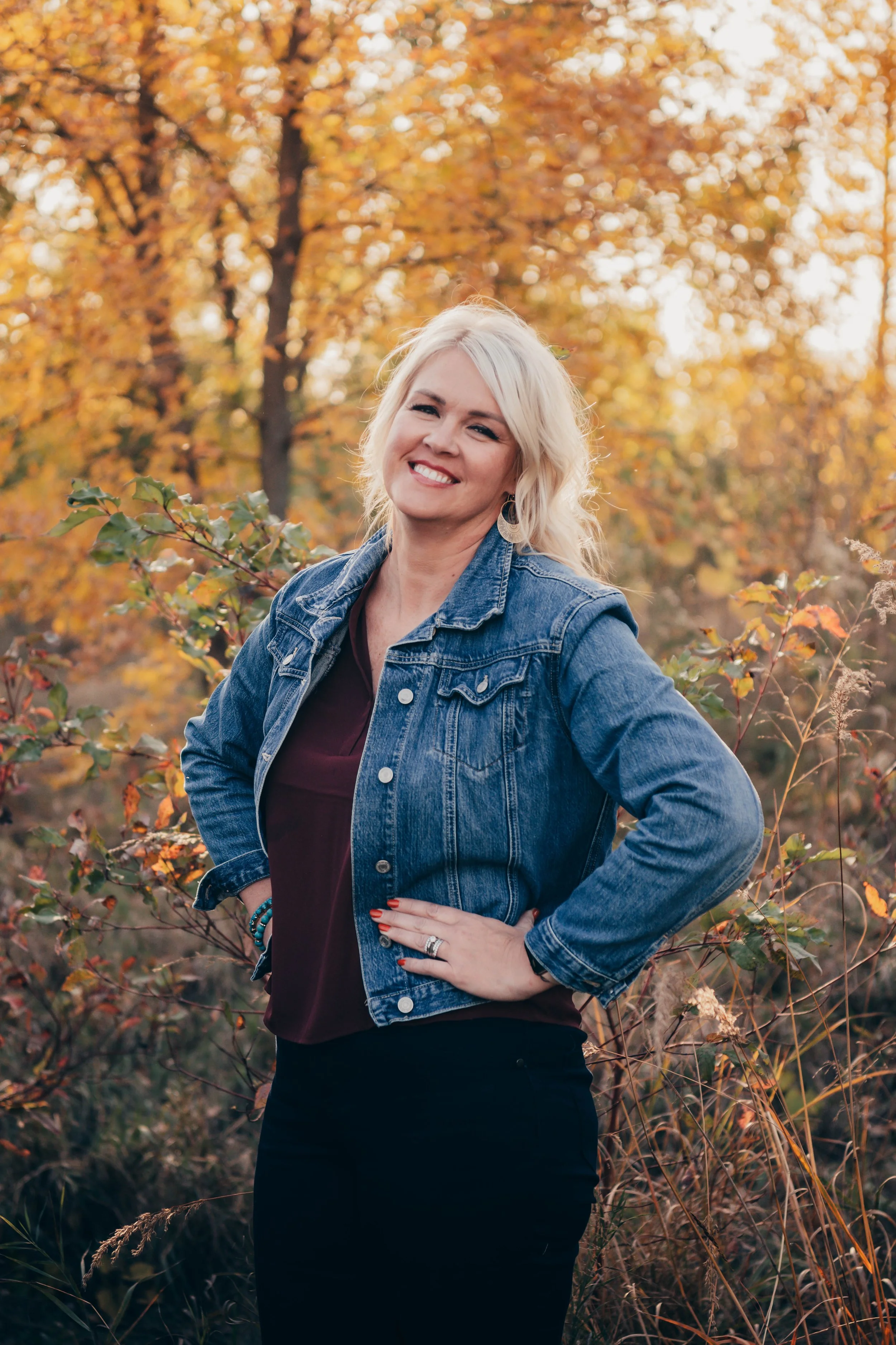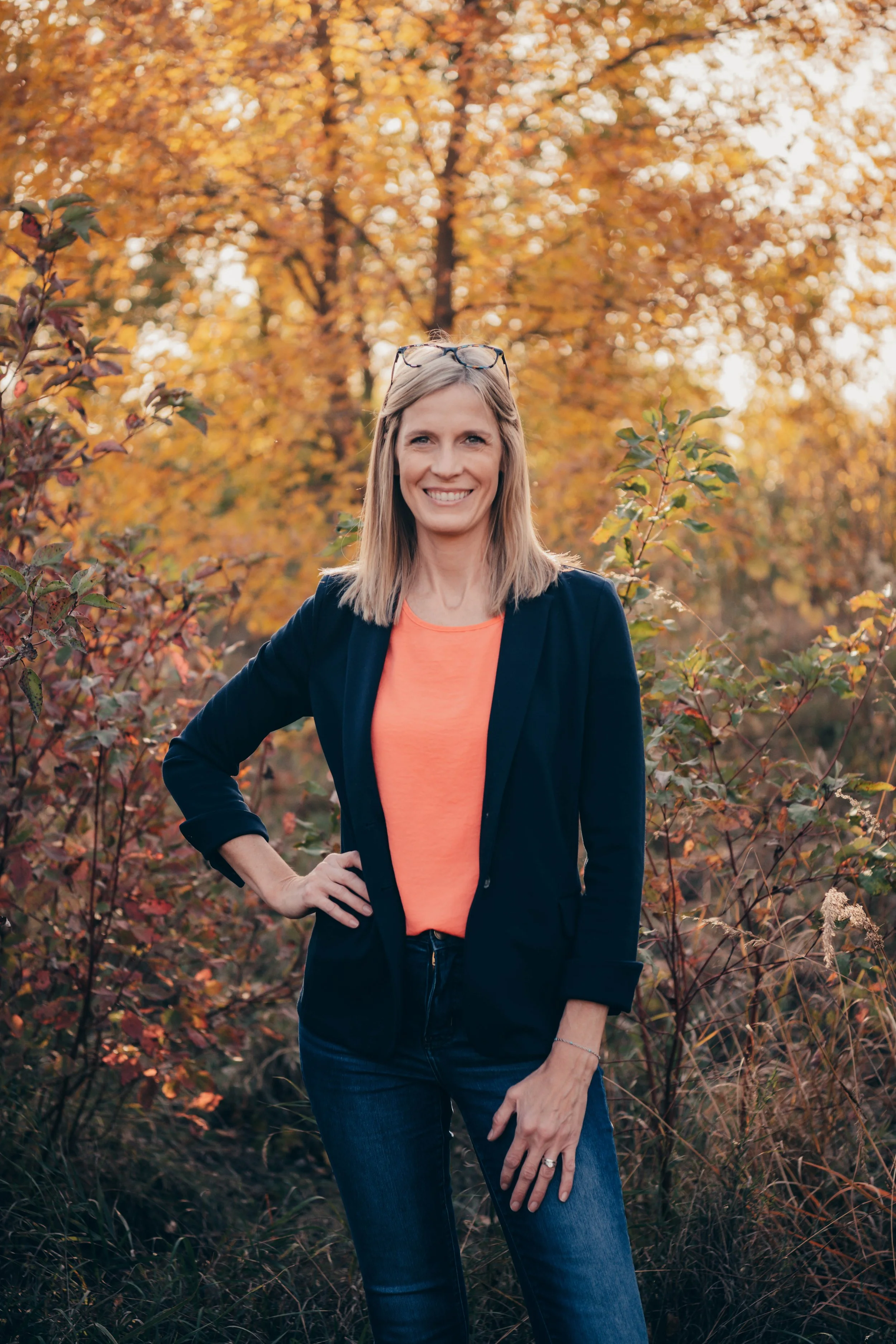 • A woman with curly hair, glasses, and a smile, standing outdoors in a natural setting with trees and foliage, wearing a floral blouse, a necklace, and a cardigan.