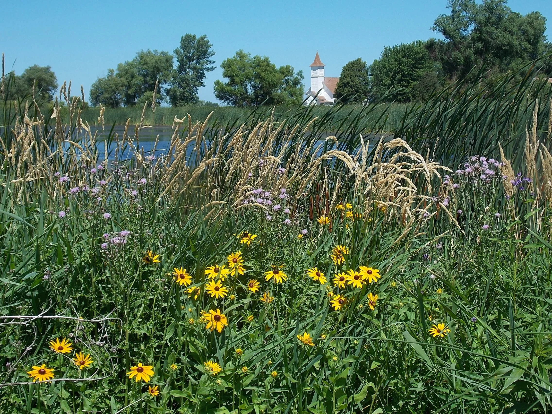 Wildflowers and tall grasses by a body of water with trees and a white church in the background.